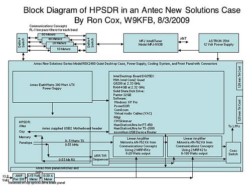 | + | It may be possible to build the rig I have in mind in the HPSDR's Pandora's box. I think it is very possible to do so if you are using a laptop computer can keep the RF powerout requirements to that needed for narrow band modes such as PSK31 and CW. I am building such a rig, but two other rigs I have built came closer to meeting the specifications above and I think with this experience, I can meet the goals set (see[[Image:IMG 1129.jpg|thumb|300px|W9KFB's HPSDR rig interior ]] and [[Image:Slide1.jpg|thumb|500px|Block diagram of W9KFB's HPSDR rig]]). | ||