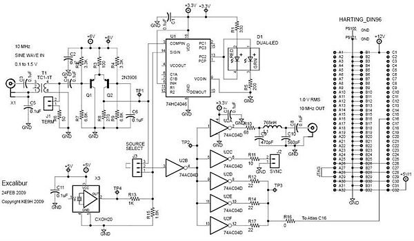 First, it can be configured to take an external 10MHz signal, such as a sine wave or square wave output from a reference standard or GPS disciplined oscillator, into a BNC input and process it into a square wave and put it on Atlas bus 10 MHz clock line C16.