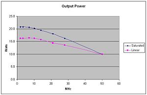 The amplifier has a single push-pull output stage that uses a pair of TO-220 “15 Watt” Mitsubishi RD15HVF1 parts, and has approximately 19 dB gain, depending where you bias it, so it will deliver 16 to 20 watts output with one-fourth watt drive.