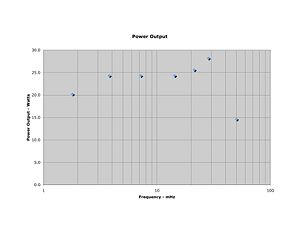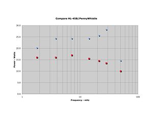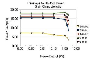Phil Crosno, N6AS, did the initial work on the selection of this amplifier to provide additional power output for a HPSDR rig. His power output of a directly connected, unmodified HL-45B to a Penelope/Mercury based transceiver is shown in Figure #2. Comparison of the HL-45B to the power output of the PenneyWhistle is shown in Figure #3 (using Penelope as the driver at 13.8 Volts in both cases).