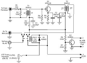 The HL-45B has a TTL level TX~/STBY input that can't connected to Penelope simultaneously with a T/R relay. It is further desirable to disable power to the IPA during receive so as not to amplify the output noise of Penelope's output buffers and present it at the T/R relay where might degrade the receiver. In this interface, Penelope controls the 12V coil of generic DPDT relay RLY1 via a connection to Pin 13 on its DB-25 port. One pole of RLY1 enables +12VDC to the IPA, the other pole provides T/R switching. The presence of +12V on the IPA throws switching transistor Q1 into saturation, keying the HL-45B through a 3mm rear panel jack and cable to its 8-pin Mini-DIN control connection.