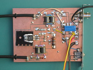 The interface was built on bare PCB laminate and mounted to a rear bracket so as to be mountable in the rear cabinet frame of a desktop PC. Lands were formed by cutting boundaries with a Dremel tool and small cutter and checked for shorts, then components were surface soldered. A matching land must be cut on the rear side foil around the heat sink so the MRF465 and sink could be mounted without the inconvenience of a thermal washer. This technique attains very small parasitics even without the few thru-holes joining the ground plane on both sides. The intent of the lands is not microstrip since no dimension is a significant fraction of a wavelength in G-10 board material even at 50 MHz. The first unit was built in stages hence the jumpers between the IPA and the T/R relay that don't appear in the layout.