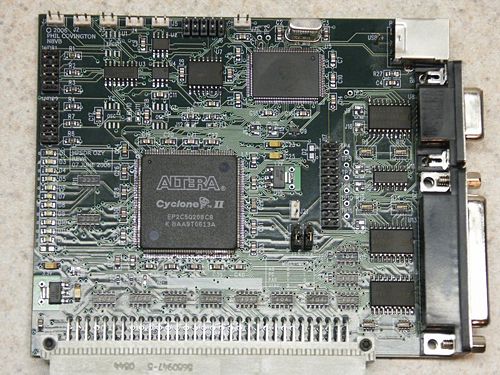 07/07/2006: OZY has been completely assembled minus two components, the Dallas serial to 1-Wire converter and a diode on the logic analyzer port (parts on backorder -estimated ship date 07/07/2006). The Cypress CY7C68013A (FX2) enumerates on USB. The I2C EEPROM on board was programmed with a C0 load with VID 0xFFFE and PID 0x0007. The CyUSB.sys driver's inf file was modified to include the VID/PID. Later the LibUSB-Win32 driver will be used instead. The Cyclone II FPGA was loaded with a test program via JTAG and the test program was successfully run. The next task is to load firmware into the FX2 to allow downloading of the FPGA code over USB.
