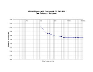 Actual measurement of the SSB Phase Noise on a HPSDR Mercury with the Pre-Amp OFF by W9KFB 10/26/2009. Note the output limit for the oscillator was reached at an offset of 1KHz.
